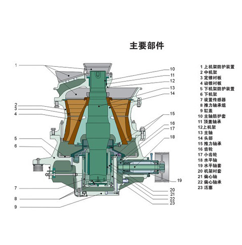 圓錐破碎機(jī)是最近研制的一種先進(jìn)的大功率、大破碎比、高生產(chǎn)率的液壓式破碎機(jī)。該機(jī)是在消化吸收了各國具有80年代國際先進(jìn)水平的各類型圓錐破碎機(jī)的基礎(chǔ)上研制成的。它與傳統(tǒng)的圓錐破碎機(jī)的結(jié)構(gòu)在設(shè)計(jì)上顯然不同,并集中了迄今為止已知各類型圓錐破碎機(jī)的主要優(yōu)點(diǎn)。適用于細(xì)破碎和超細(xì)破碎堅(jiān)硬的巖石、礦石、礦渣、耐火材料等。圓錐破碎機(jī)結(jié)構(gòu)簡介及主要參數(shù):圓錐破碎機(jī)其結(jié)構(gòu)主要有機(jī)架、水平軸、動(dòng)錐體、平衡輪、偏心套、上破碎壁(固定錐)、下破碎壁(動(dòng)錐)、液力偶合器、潤滑系統(tǒng)、液壓系統(tǒng)、控制系統(tǒng)等幾部分組成.