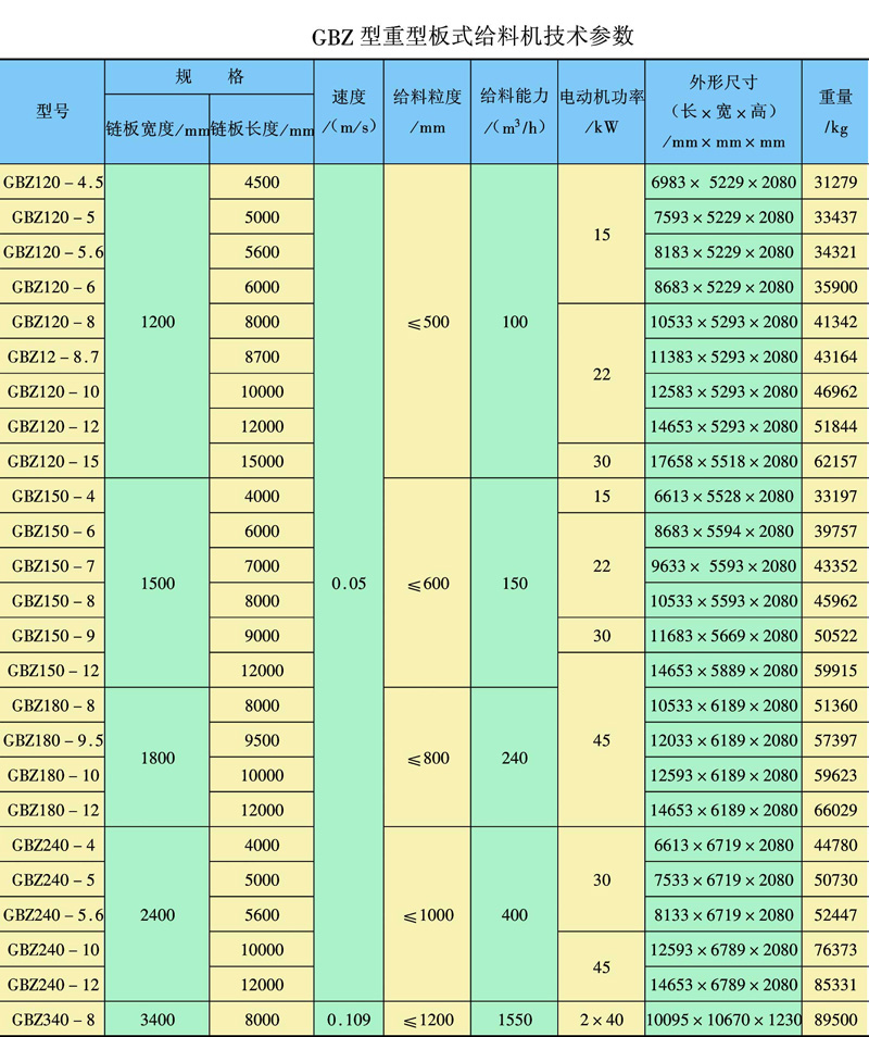 板式給料機(jī)基本原理:板式給料機(jī)是由傳動系統(tǒng),鏈板輸送機(jī)構(gòu),料倉及機(jī)架構(gòu)成;其中輸送機(jī)構(gòu)的鏈板,鏈條,插銷,滾輪等為易損件,以不同的使用強(qiáng)度和頻率,率先出現(xiàn)磨損變形,需要用戶更換板式給料機(jī)剛度高,可適應(yīng)一定粒度的大塊物料,料倉容積大,可有效縮短鏟車送料時間,但同時鏈板傳動速度較慢,承載能力大。技術(shù)參數(shù)