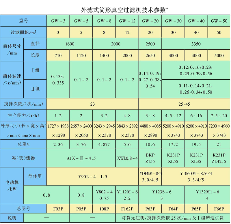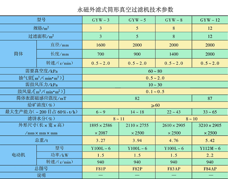 筒體內(nèi)部裝有鍶鐵氧體永久磁系,可促使磁性顆粒迅速吸附到濾布表面,磁濾機主要用于粒度較粗的強磁性礦物精礦礦漿的脫水,由于是上部給料,使得濾餅中精礦按粒度分層的效果更加明顯,當(dāng)磁性精礦形成濾餅時,顆粒同時受到重力和磁力的作用,粗顆粒精礦比細顆粒精礦向濾布運動的快,精粒首先接觸濾布,故濾餅的透氣性好,而且礦漿中磁性顆粒在磁力吸引下呈放射狀布于圓筒表面,并由于磁系極性變化而產(chǎn)生磁攪動作用,這都成為濾餅易脫水的有利條件,使得濾餅厚且透氣性好,顯著地提高了生產(chǎn)率,與同規(guī)格的筒形真空過濾機相比,其效率提高三倍以上。技術(shù)參數(shù)